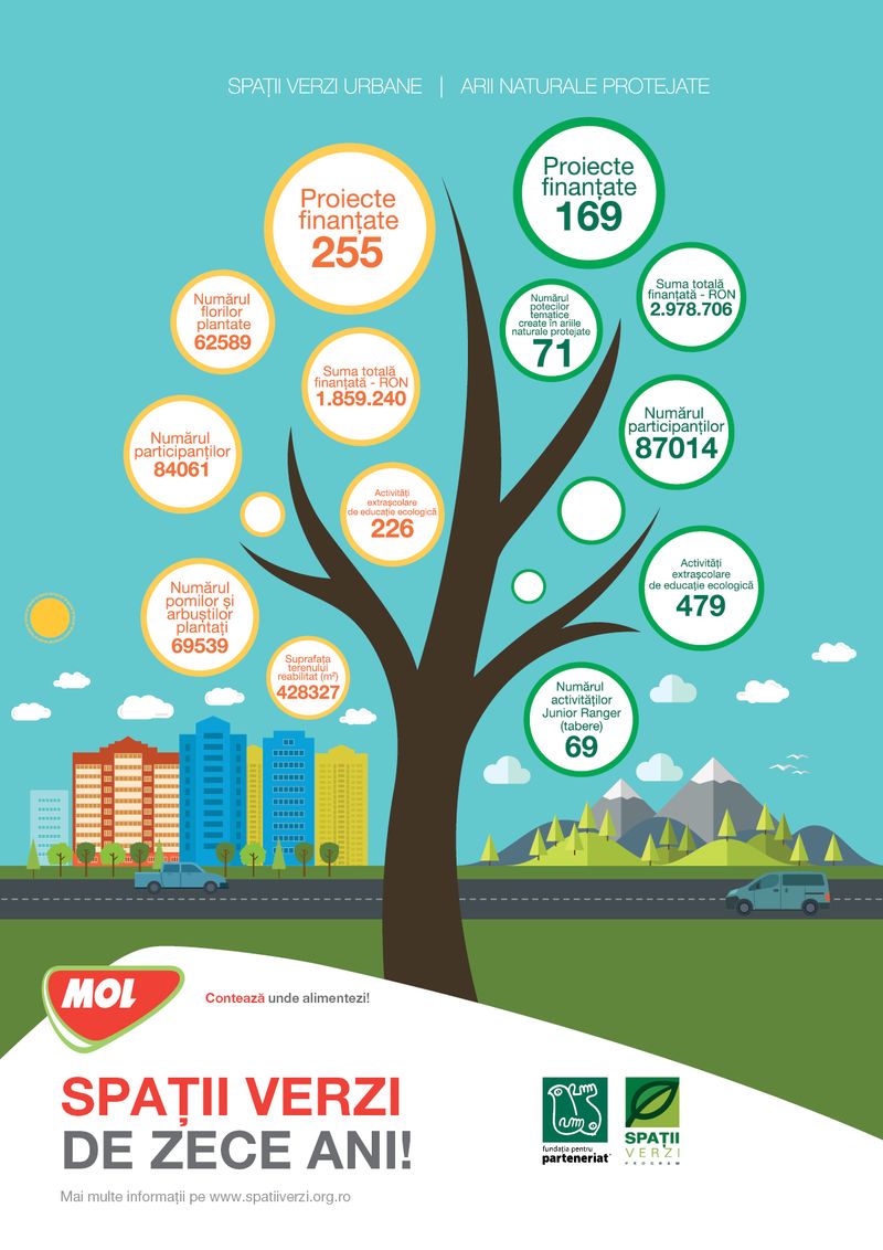 Cel mai vechi program de responsabilitate sociala al MOL Romania – Spatii Verzi, desfasurat impreuna cu Fundatia pentru Parteneriat, implineste un deceniu de existenta neintrerupta. Prin intermediul acestei platforme au fost plantati 69.000 de pomi si arbusti, au fost reabilitate terenuri cu o suprafata de 428.000 de metri patrati si au fost amenajate 71 de poteci tematice in ariile naturale protejate. In cei zece ani de la lansarea programului Spatii Verzi, MOL Romania si Fundatia pentru Parteneriat au finantat 424 de proiecte cu o suma totala ce depaseste 4,8 milioane de lei. Peste 170.000 de copii si tineri au fos