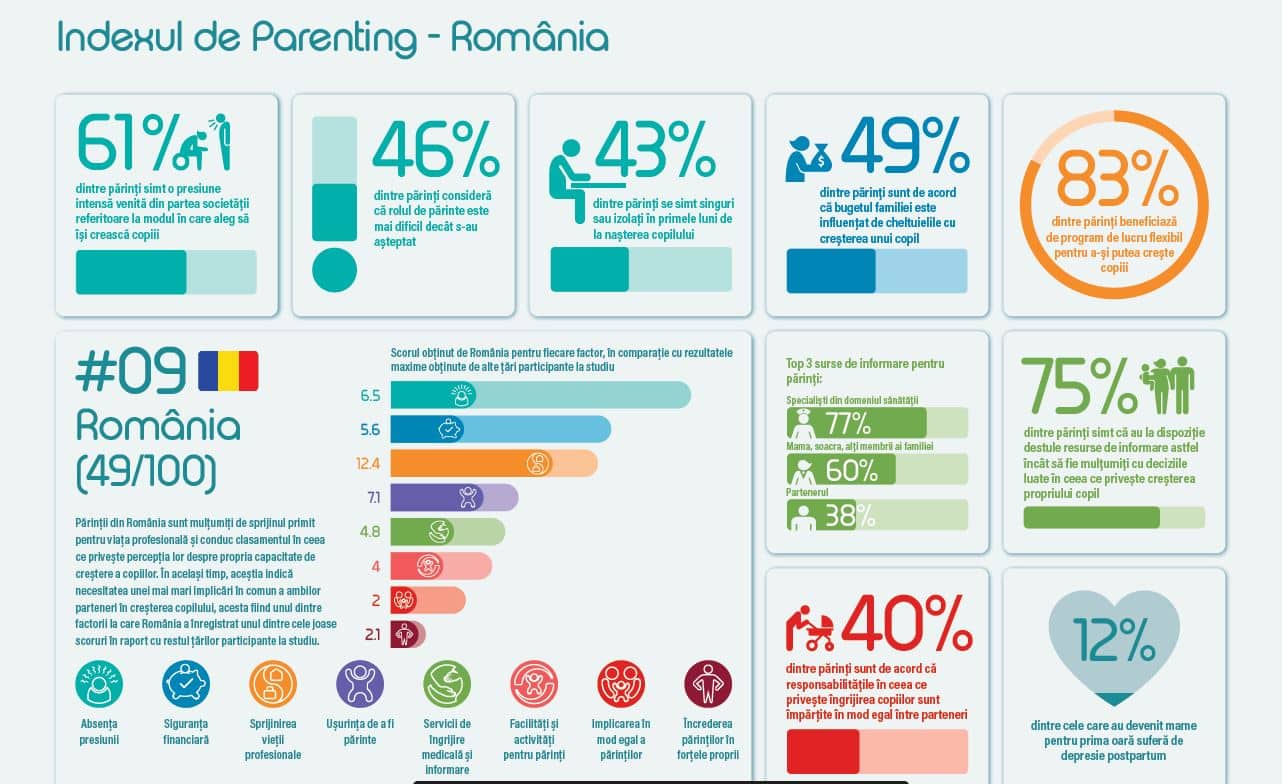 Studiul indică pentru România un scor de 49 în cadrul Indexului de Parenting, rezultat care arată un raport echilibrat optimism – pesimism în rândul părinților din țara noastră și scoruri medii pentru majoritatea factorilor analizați în studiu. În ceea ce privește încrederea părinților în capacitatea lor de creștere a copilului, România se află pe primul loc în rândul tuturor țărilor analizate.