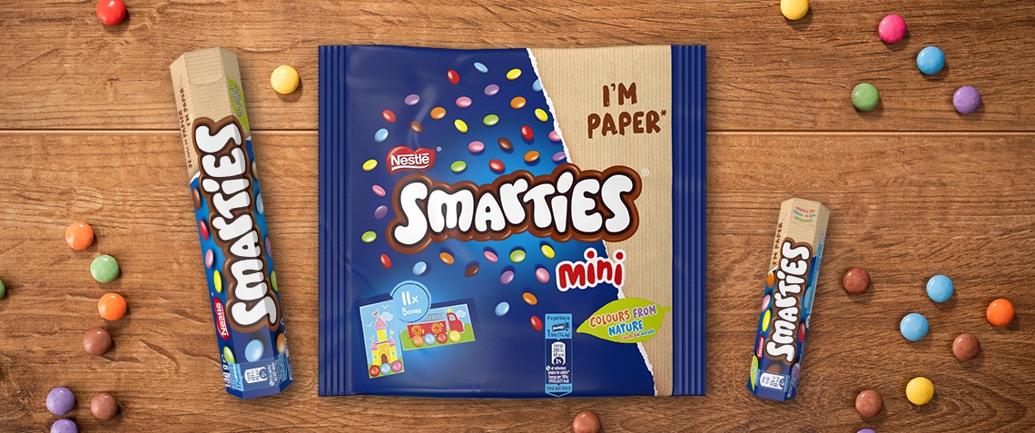Marca de bomboane de ciocolată Smarties, detinuta de compania Nestlé, va folosi numai ambalaje din hârtie reciclabilă pentru întreg portofoliul global. Smarties este primul brand global de dulciuri care trece la 100% ambalaje din hârtie reciclabilă, eliminând astfel aproximativ 250 de milioane de ambalaje din plastic la nivel global în fiecare an.